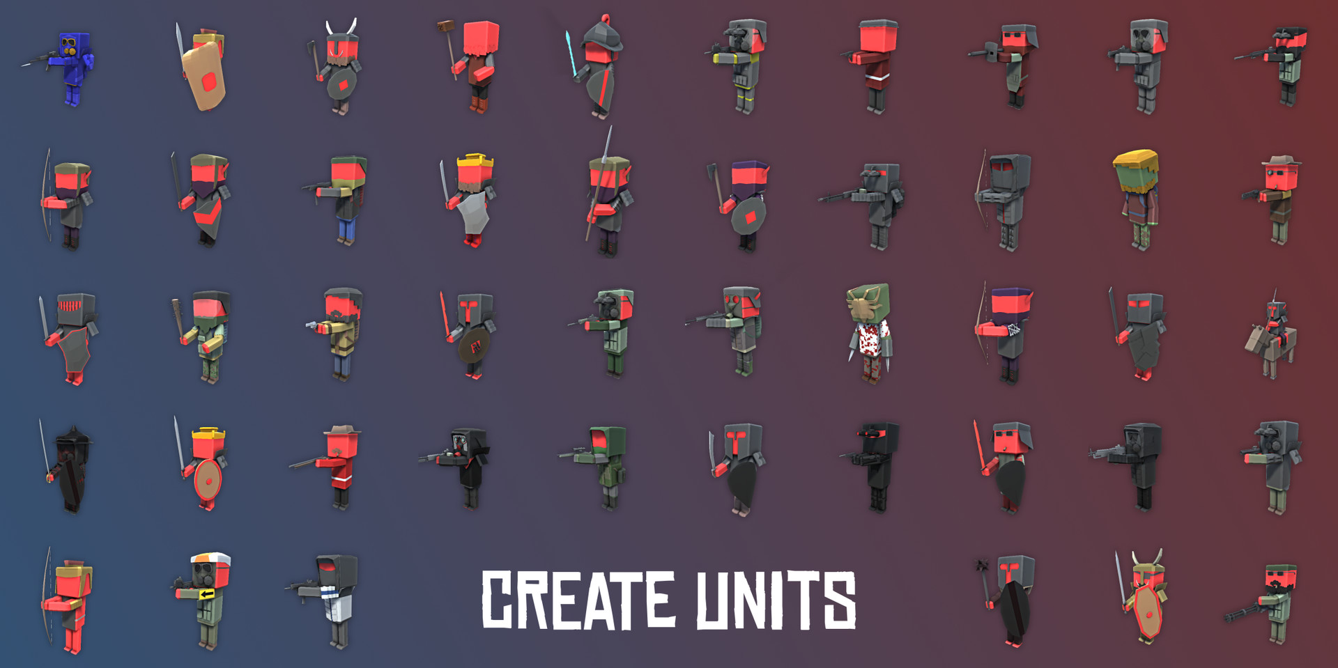 Share your battles, units and prefabs in the Workshop or quickly download some content from over 14000 workshop items.Much content is already in game and in the workshop and there are still much more gamemodes, units, weapons and equipment planned. Until then, you can test the 1771+ units in game with 375+ equipment items and place 380+ different objects.