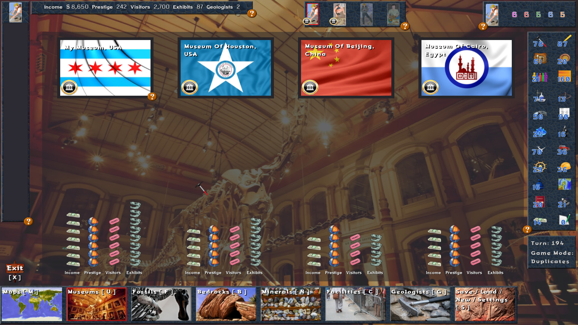 Your museum is empty and needs exhibits! Send your team of geologists to sites across the world to find fossils, bedrocks and minerals to fill your museum.