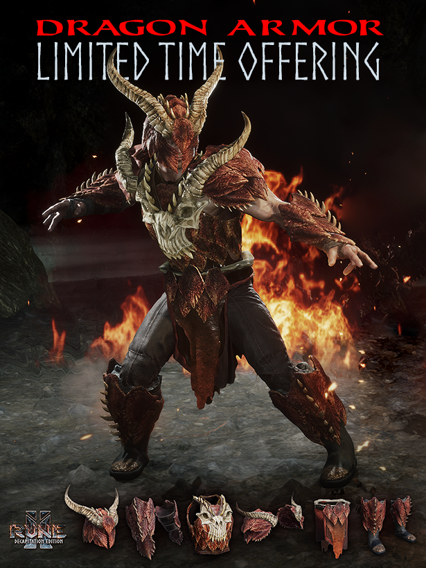 Forged in the fires deep within caverns of Hel's precipice, reinforced by dark and forbidden runic magic, and assembled by undead Draugr smiths from ages unknown. This Legendary Dragon Armor was made for worthy Vikings to wear in honor of Gunnar, the slayer of dragons.