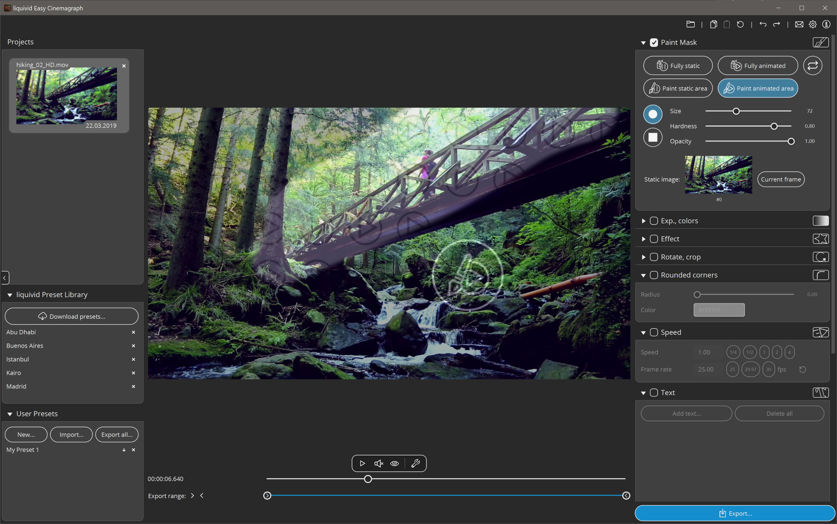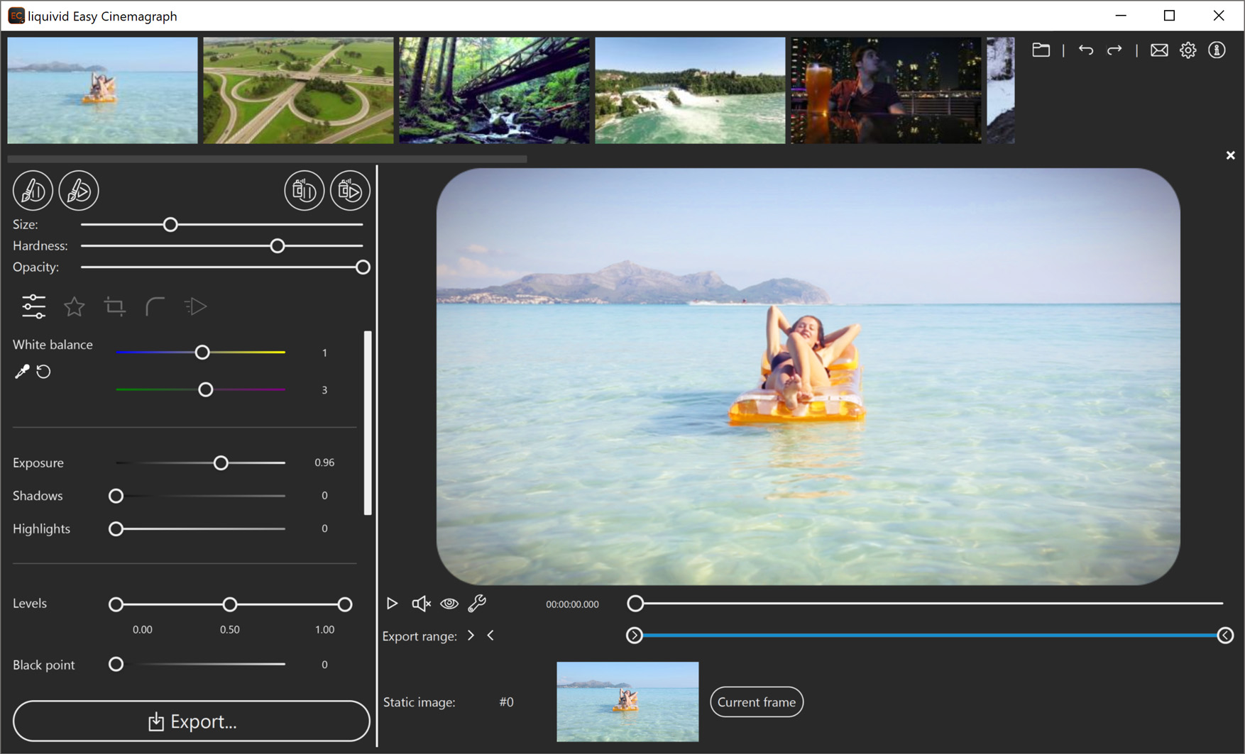 Easy Cinemagraph makes creating cinemagraphs really easy: import a video, paint static areas and preview the result. You can also adjust dozens of parameters like exposure or colors, add visual effects and crop as you like. Export as an animated GIF or a classic video file ready to be uploaded.