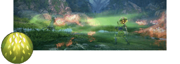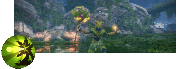 Launches a projectile in the selected direction. Speed is 20 yd/sec, range is 40 yards. When hitting an enemy, an obstacle, or when reaching the maximum flight range, it explodes in a 7 yard radius, dealing damage to enemies and turning nearby acorns into flowers. It also spawns flowers in a 2 yard radius as it flies. Flowers attack nearby enemies, spitting at them. The maximum number of flowers at any time is 4. Flowers’ lifespan is 10 seconds.