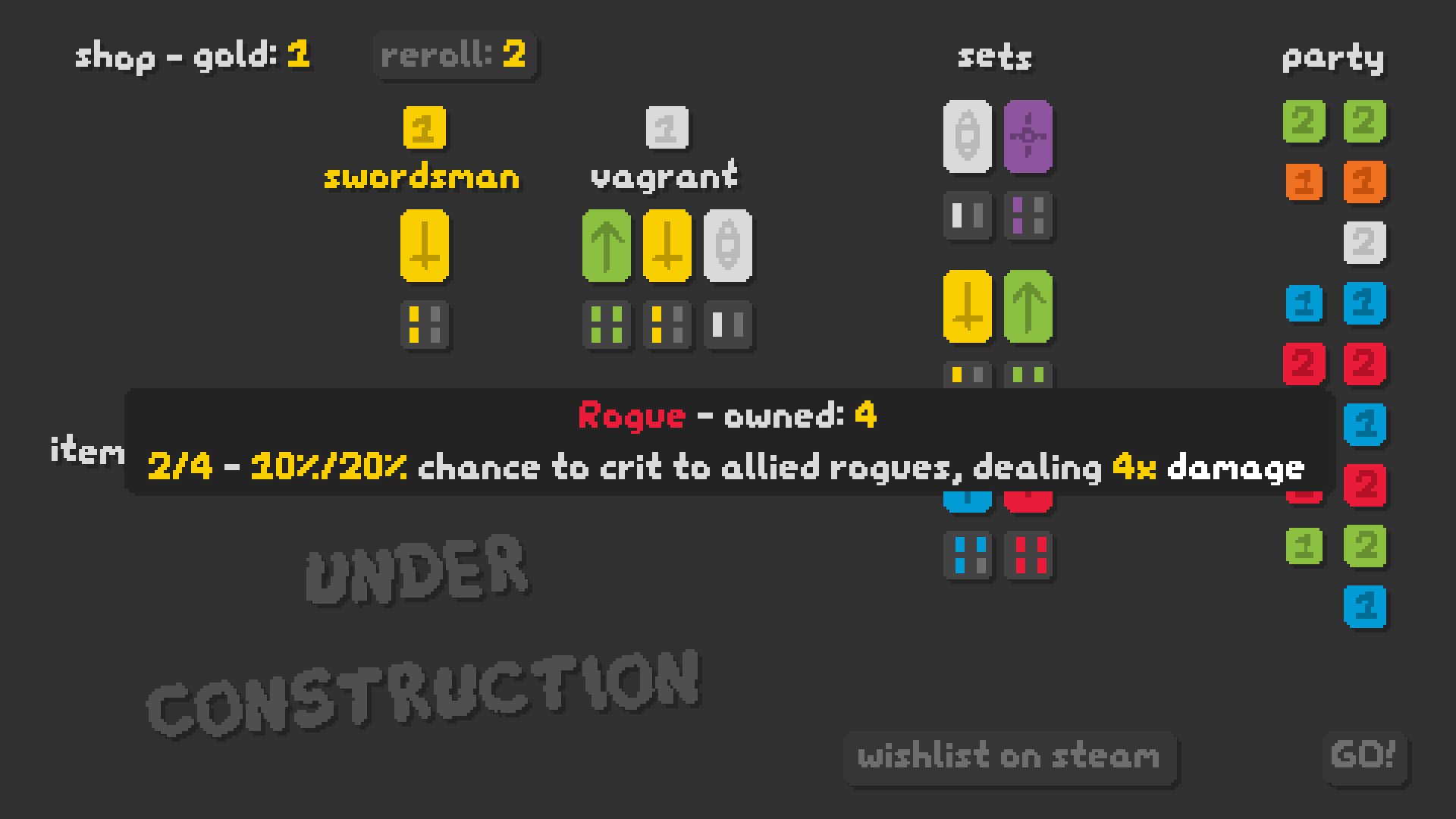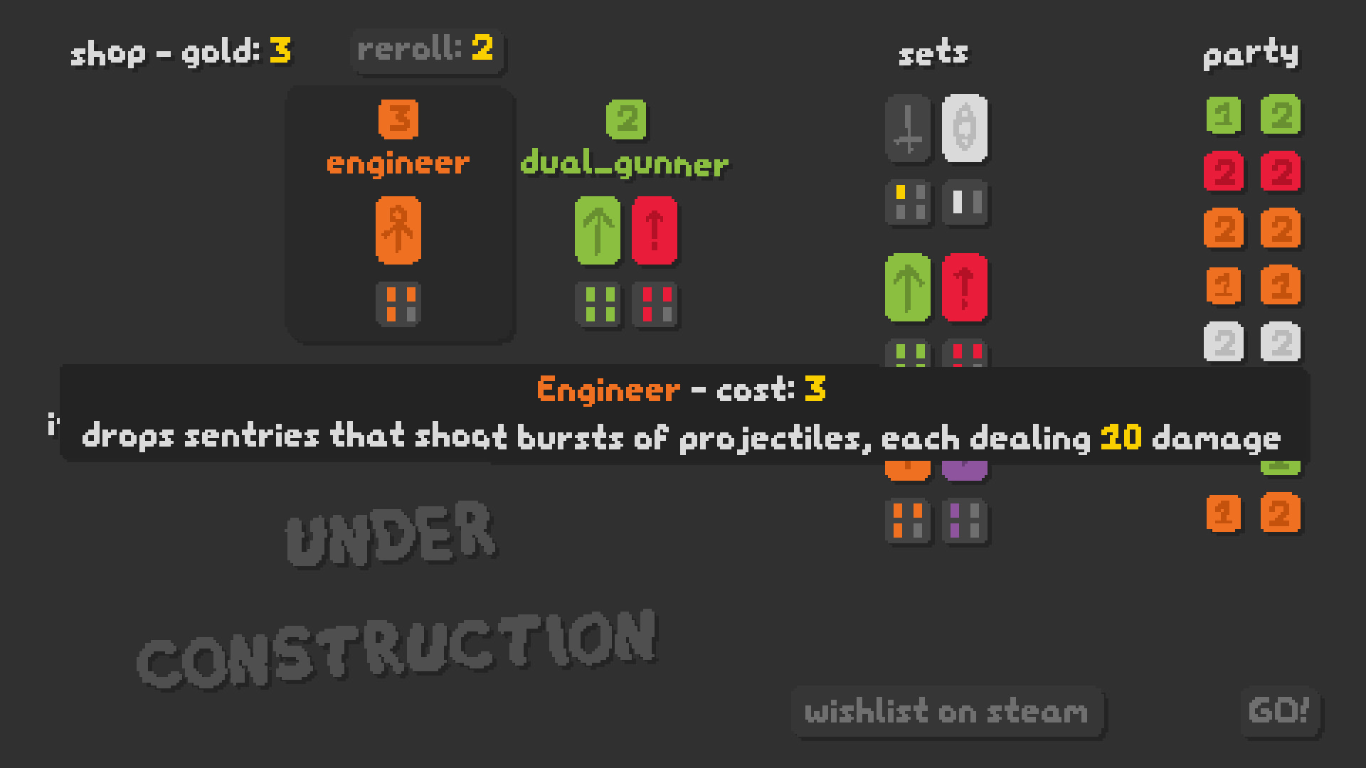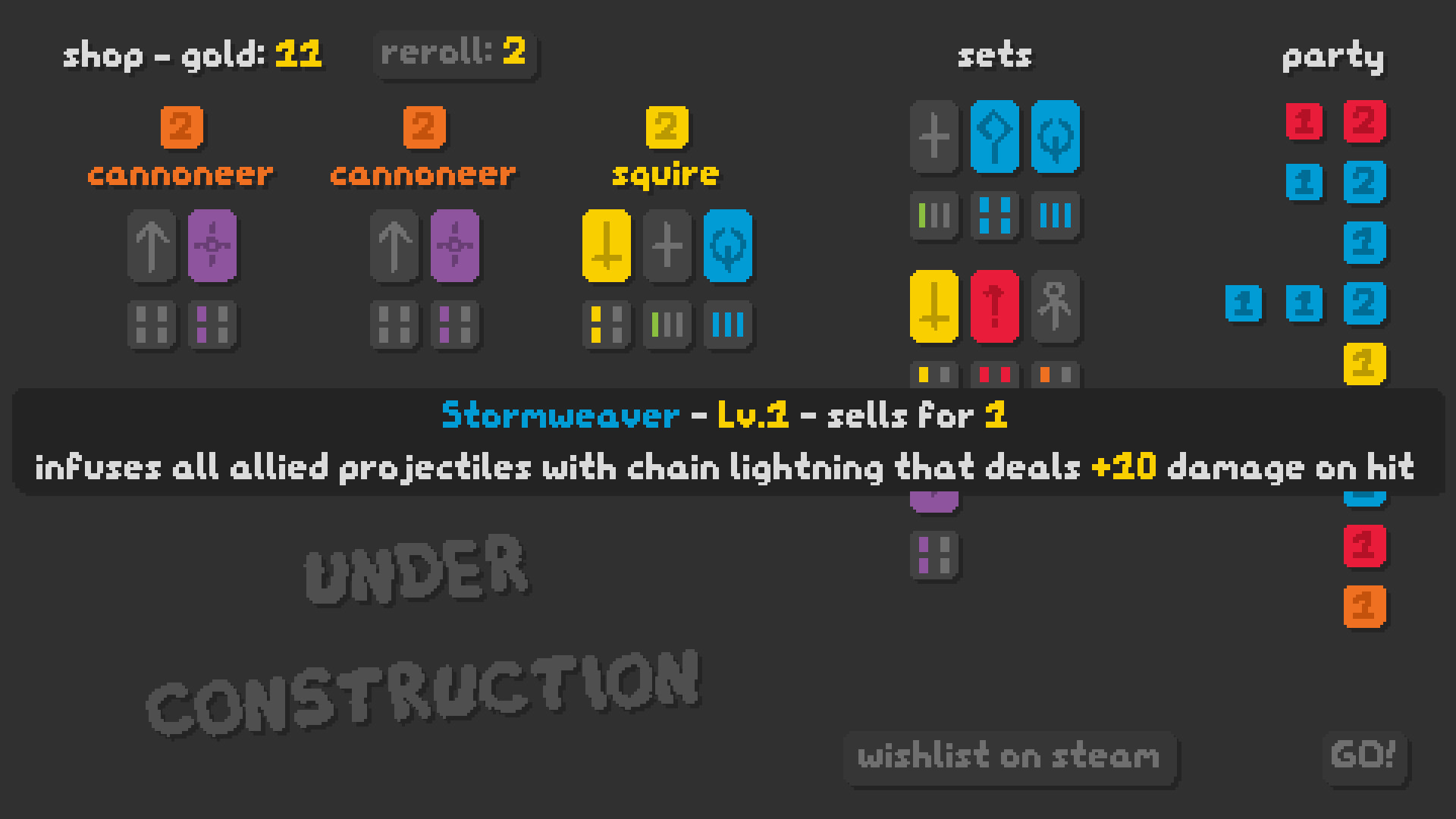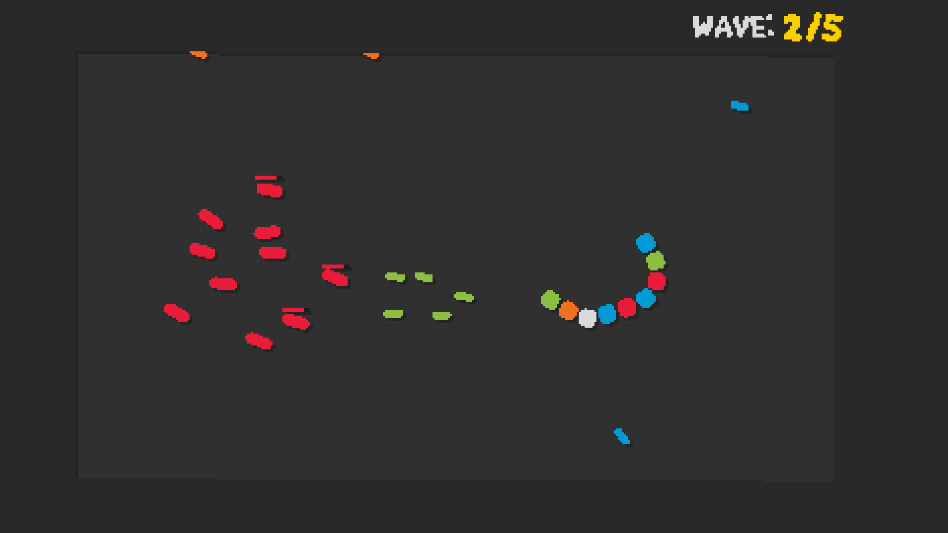 SNKRX is an arcade shooter roguelite where you control a snake made of characters, with each one having their own attacks, passives and classes. Inspired by the auto-battler genre, each character in the snake has a set of classes, and combining enough units of the same class together grants additional class bonuses. Characters can also be upgraded to be more powerful when copies are bought from the shop.